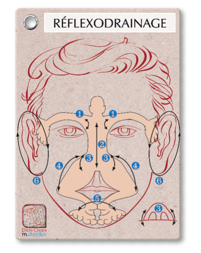 Le Réflexodrainage est particulièrement re-commandé pour stimuler le système lympha-tique. Sur les zones réflexes faciales indiquées, exercez une dizaine de balayages à l’aide du gros détecteur de l’outil multireflex «Comète».